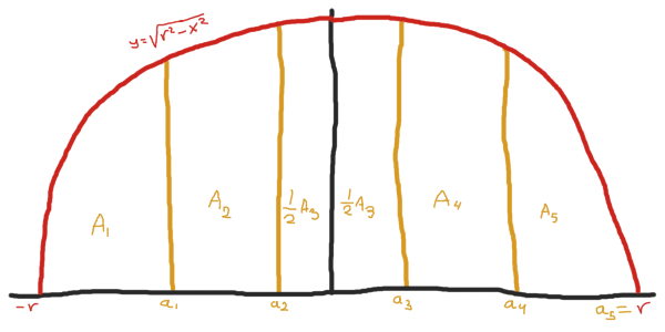Dado que la fórmula de la media circunferencia es \(y=\sqrt{r^2-x^2}\), y que nuestra pizza teórica es un círculo perfecto, podemos obtener el área acumulada de los primeros \(i\)-pedazos de forma alternativa a la mostrada en la ecuación \((1)\), integrando la función entre \(-r\) y \(a_i\):